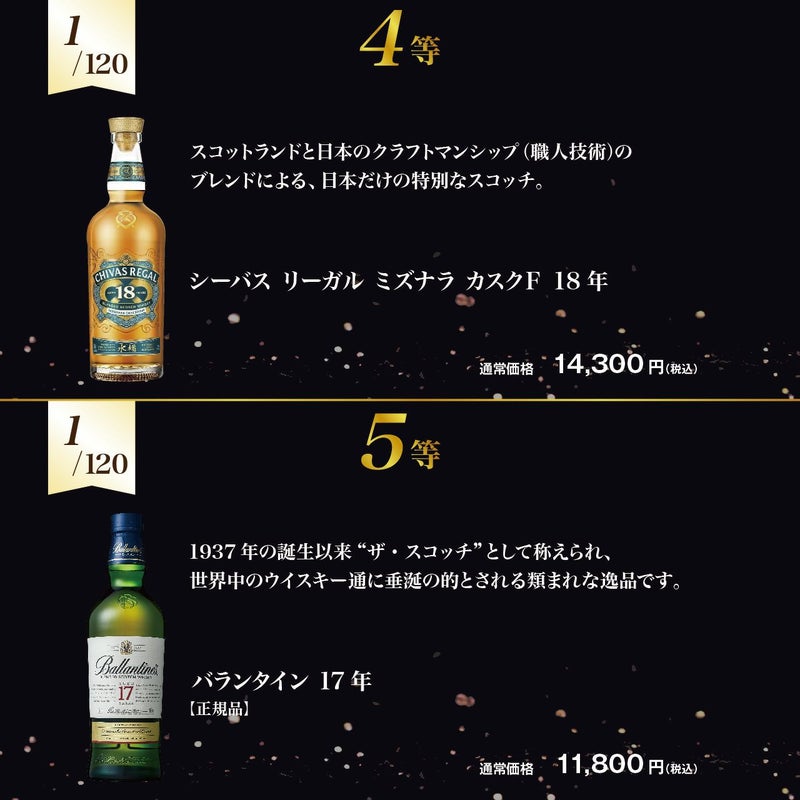 今回、初めて購入して、5等のシーバスリーガル18年が当たりました。 たまたま、自宅に同じシーバスリーガル18年の在庫があり、これで気兼ねなく飲むことが出来ます。 次回はかみさん好みのアイラ・ウィスキーを購入したいと思います。