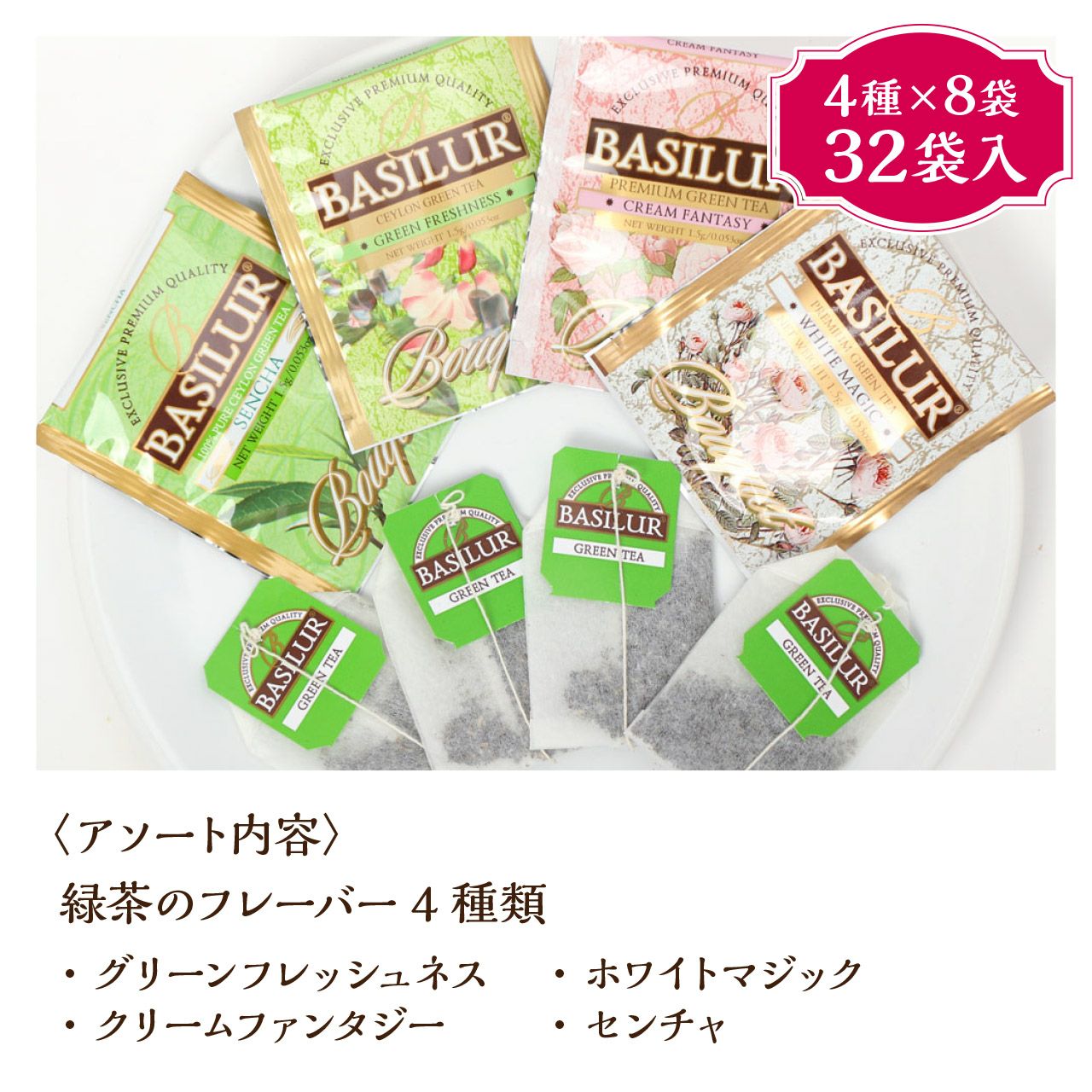 アソート内容は、グリーンフレッシュネス、ホワイトマジック、クリームファンタジー、センチャです。