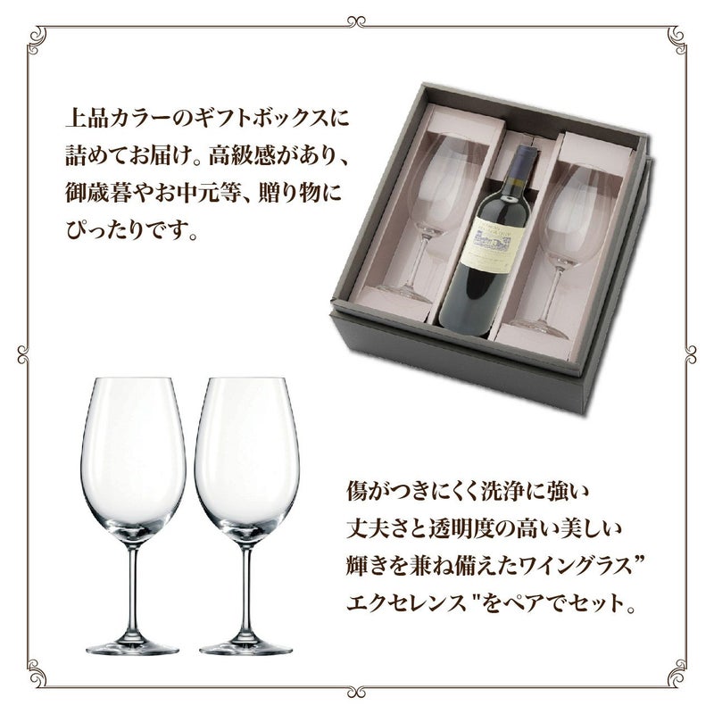 上品なカラーのギフトボックスに、当店で厳選した赤ワインとペアグラスを詰めてお届け。