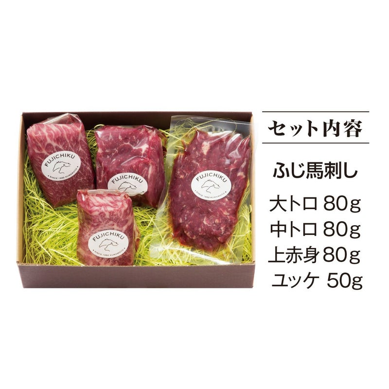 馬刺し大トロ80g・中トロ80g・上赤身80g・ユッケ50g 計290g ※タレ・生姜小袋付。