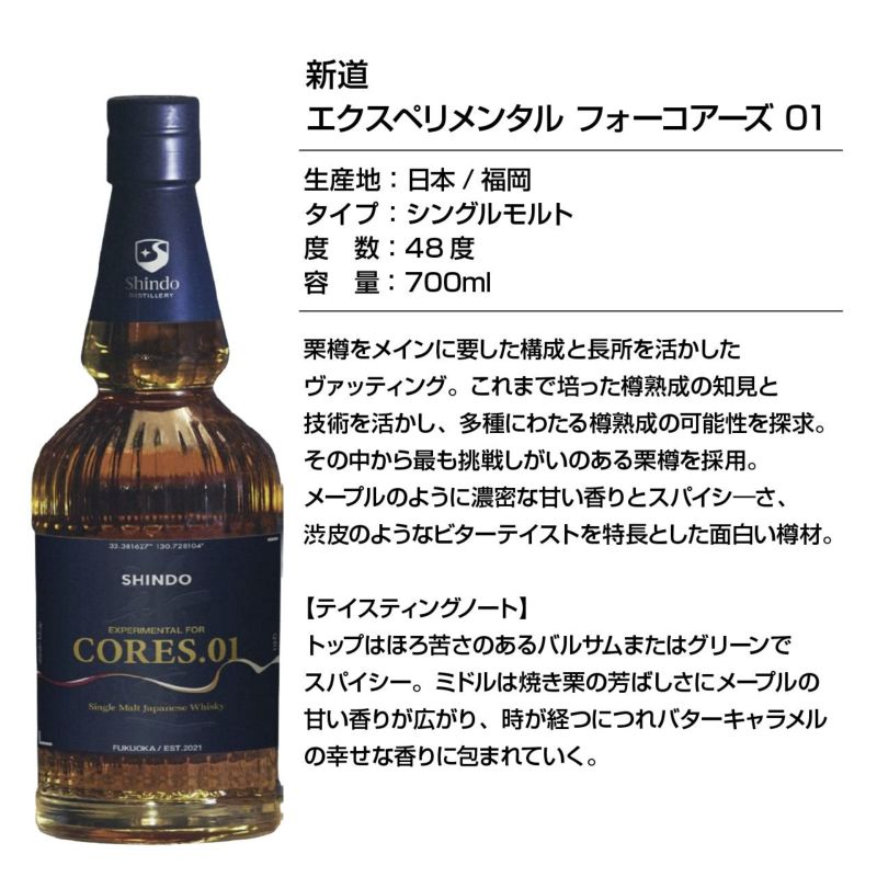 「王道にして、新道を」思想のひとつとして掲げる新道蒸溜所においてはじめてお届けするピーテットタイプ。フェノール値50ppm程度のヘビーピーテッド麦芽でニューメイクを製造し、バーボン樽にて熟成。複数のノンピート原酒とヴァッティングし一辺倒にならない香味設計し原酒がもつミルキー、ファッティな香味や重甘く長い余韻とも調和させました。