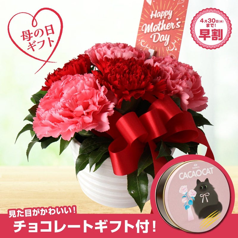 母の日オープンアレンジメント(赤とピンクのカーネーション)とチョコレートギフトセットA