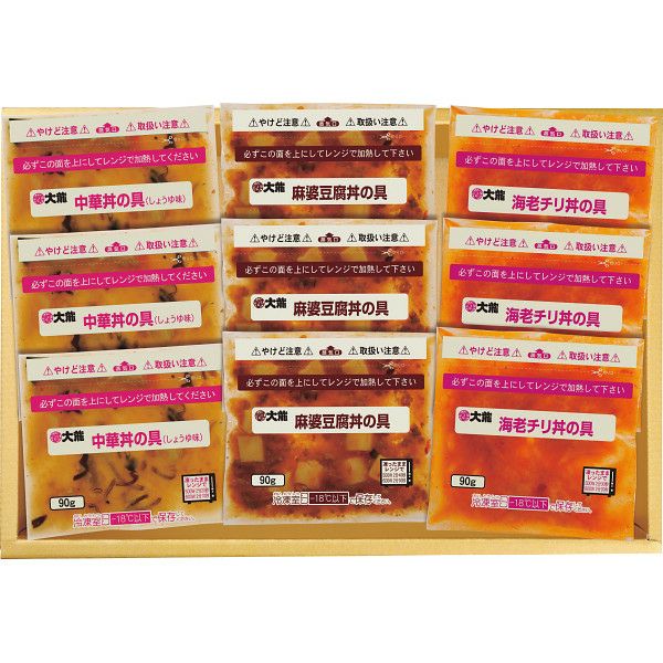 ●海老チリ丼の具90g×3、中華丼の具(醤油味)90g×3、麻婆豆腐丼の具90g×3。