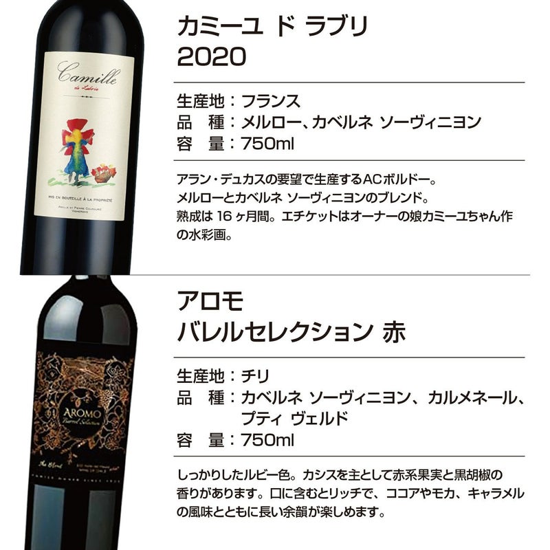 アラン・デュカスの要望で生産するACボルドー。メルローとカベルネソーヴィニョンのブレンド。熟成は16ヶ月間。エチケットはオーナーの娘カミーユちゃん作の水彩画。