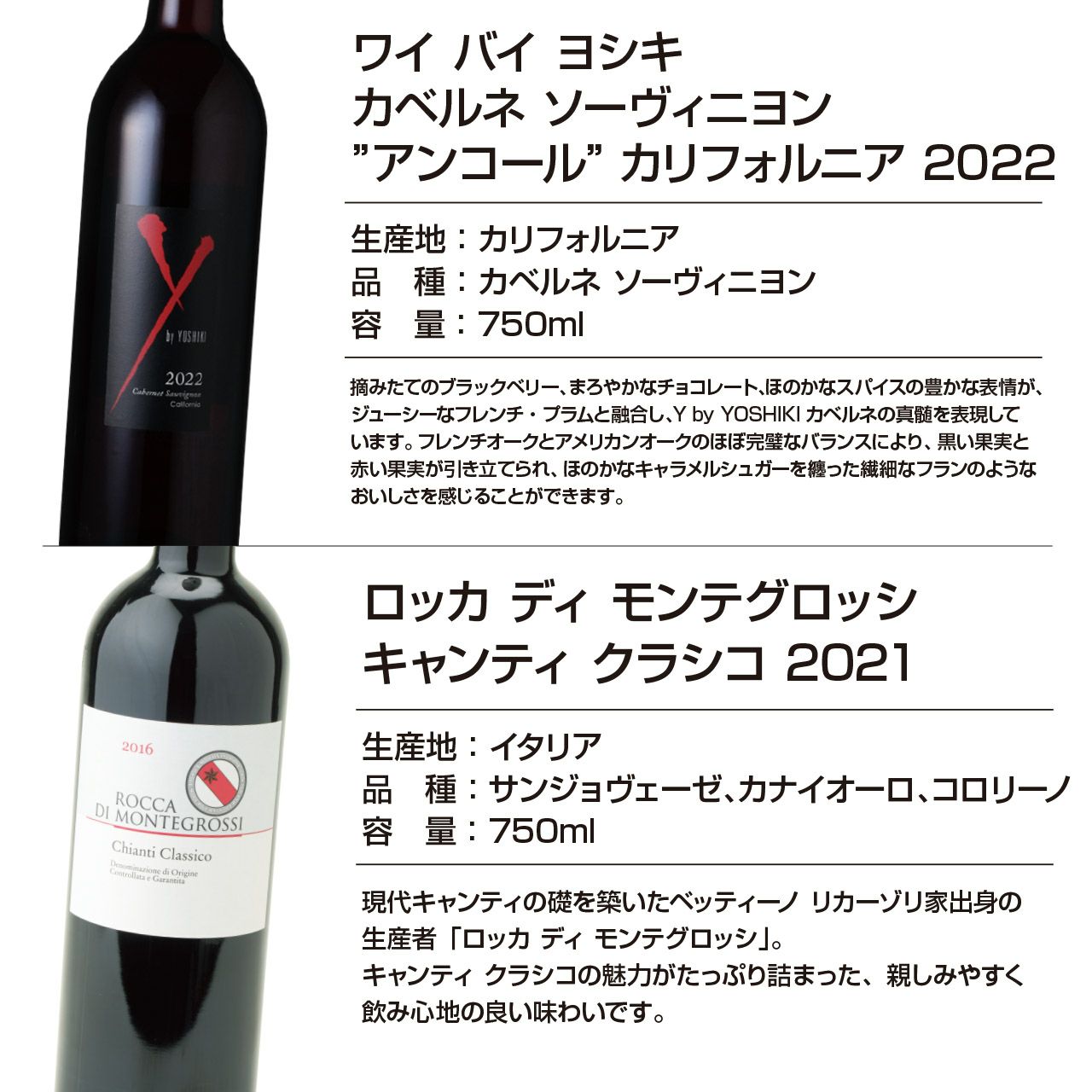 摘みたてのブラックベリー、まろやかなチョコレート、ほのかなスパイスの豊かな表情が、ジューシーなフレンチ・プラムと融合し、Y by YOSHIKIカベルネの真髄を表現しています。フレンチオークとアメリカンオークのほぼ完璧なバランスにより、黒い果実と赤い果実が引き立てられ、ほのかなキャラメルシュガーを纏った繊細なフランのようなおいしさを感じることができます。