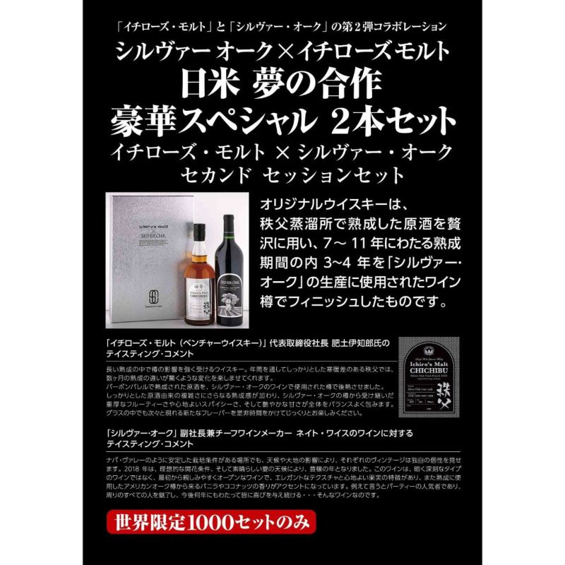 イチローズモルト×シルヴァーオーク コラボレーションセット(セカンドセッション) 日本のクラフトウイスキーを代表する「イチローズ・モルト」を生産するベンチャーウイスキーとコラボレーションしたウイスキー「イチローズ・モルト 秩父 シルヴァー・オーク カスクフィニッシュ2023」と「シルヴァー・オーク ナパ・ヴァレー カベルネ・ソーヴィニヨン 2018」のスペシャルなセットが誕生!