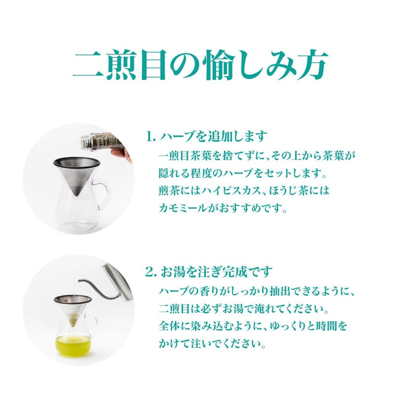 一煎目で日本茶の味と香りを楽しんだら、二煎目は茶葉の上からオリジナルハーブを加えたブレンド茶葉で、 また違った香りと味わいを楽しんでいただくことができます。