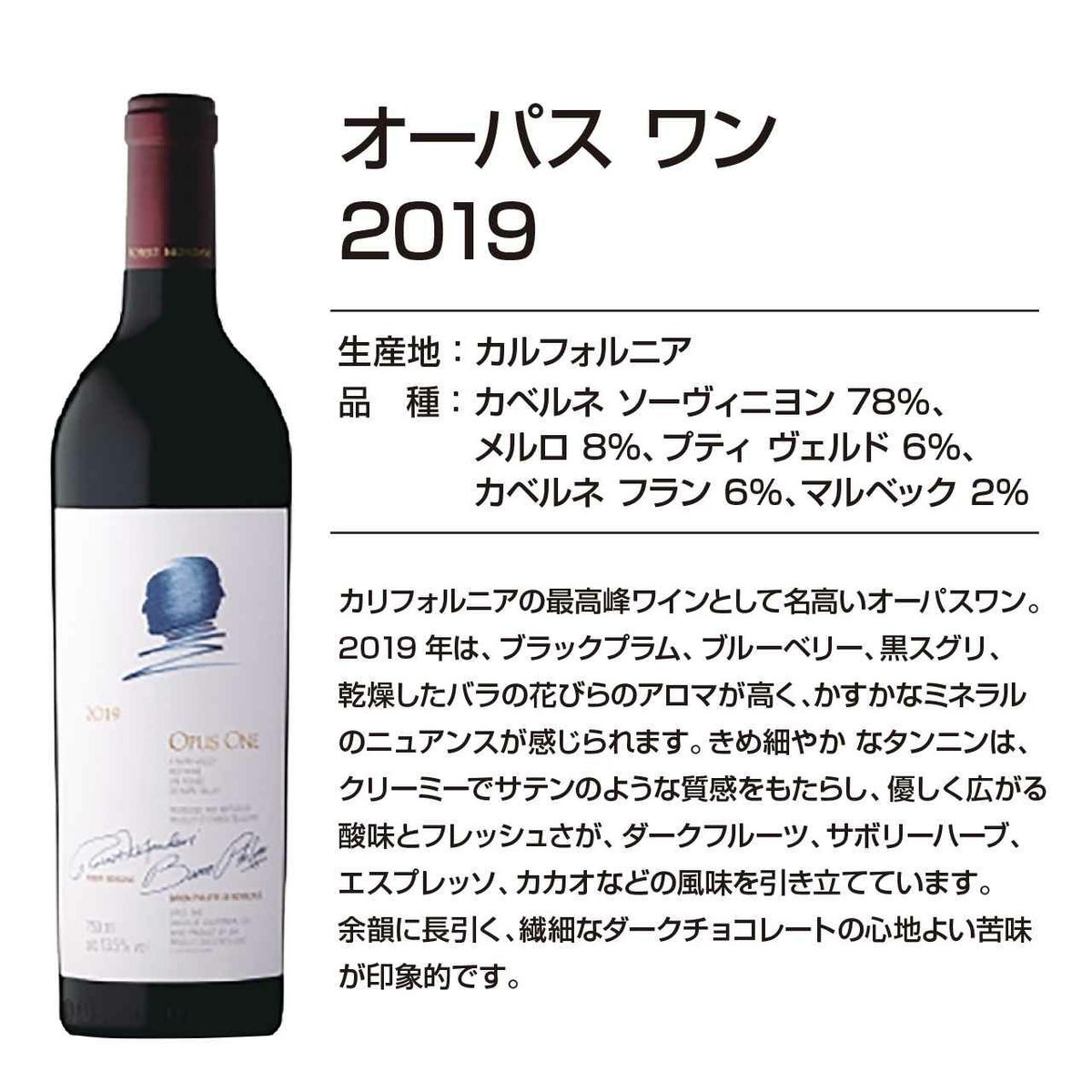 他の画像を見る (0) 世界で最も有名なアメリカ・カルフォルニアの最高級赤ワイン 【特別価格】オーパスワン2019【特価12本限定販売!】 定価 ¥ 78,000 のところ ¥ 59,880 税込 在庫なし 詳細を見る お気に入り登録