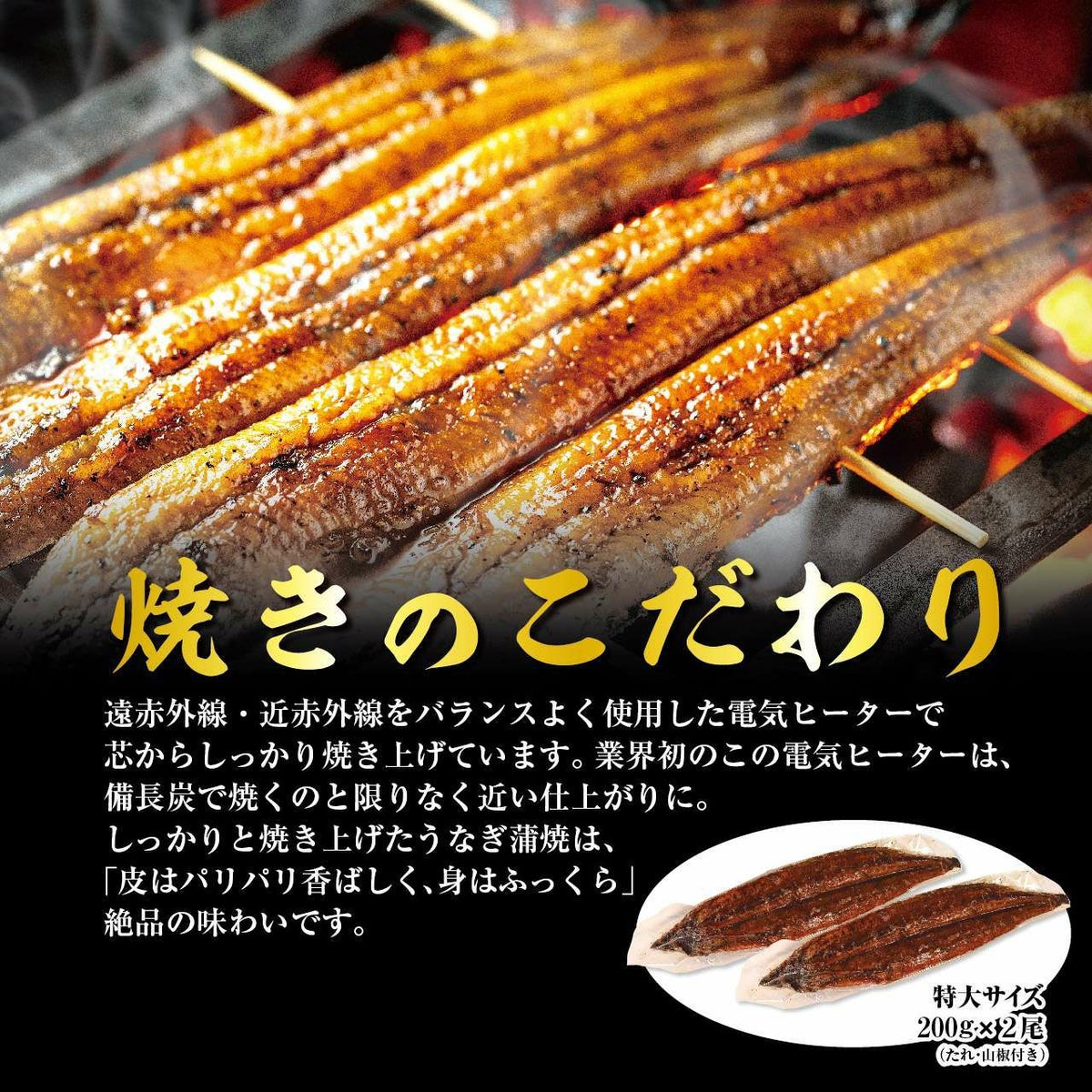 南九州産うなぎ 長焼き200g 2尾 【自宅用】 ※食べ方説明書、タレ&山椒付き
